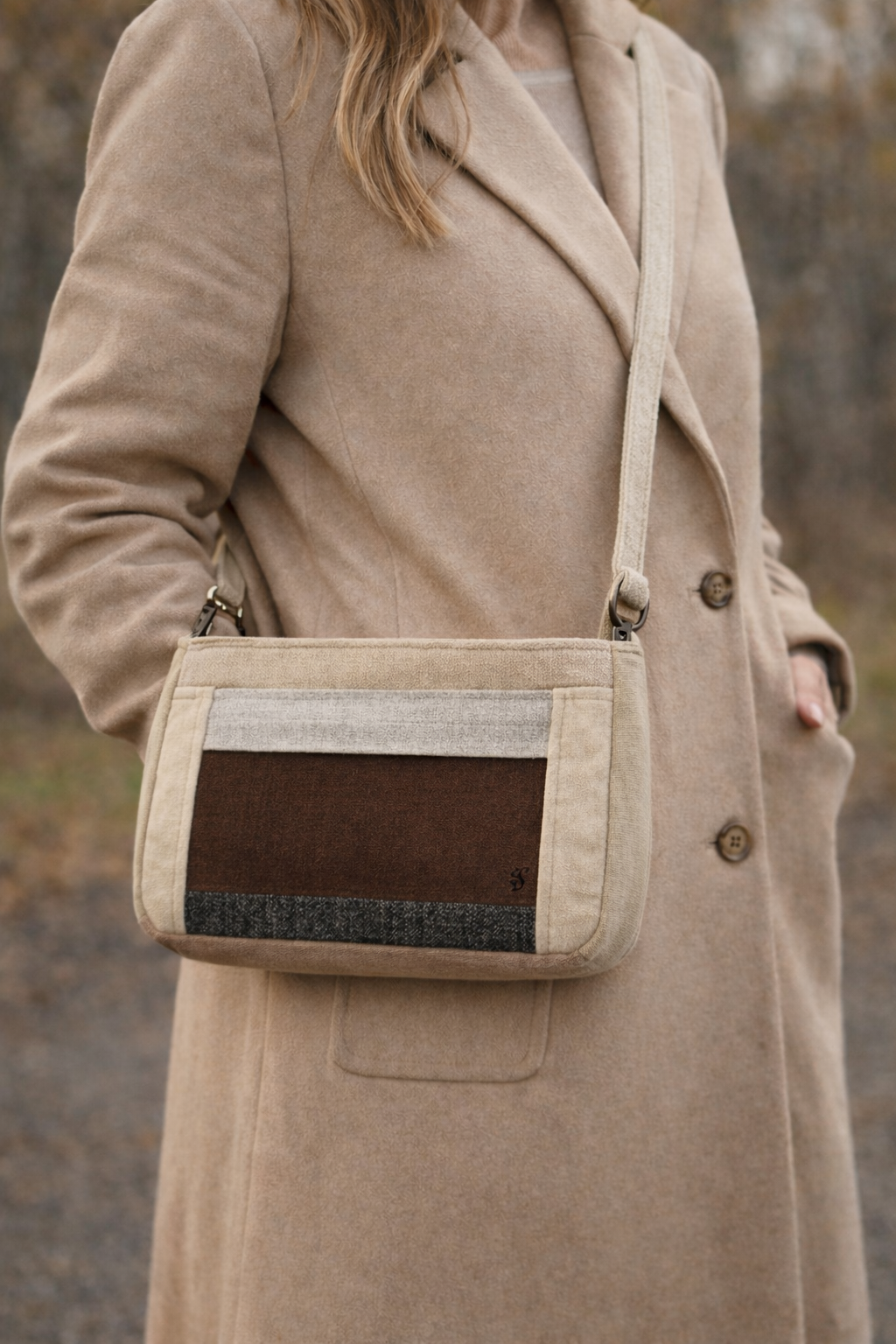 The handmade patchwork messenger bag is an original design that combines nature core aesthetics with the principles of responsible fashion. Each piece is the result of meticulous craftsmanship, where scraps of high-quality upholstery materials are given a second life. This particular composition, in shades of beige, deep brown, and graphite, is the perfect complement to a capsule wardrobe, offering a uniqueness you won’t find in mass production.
