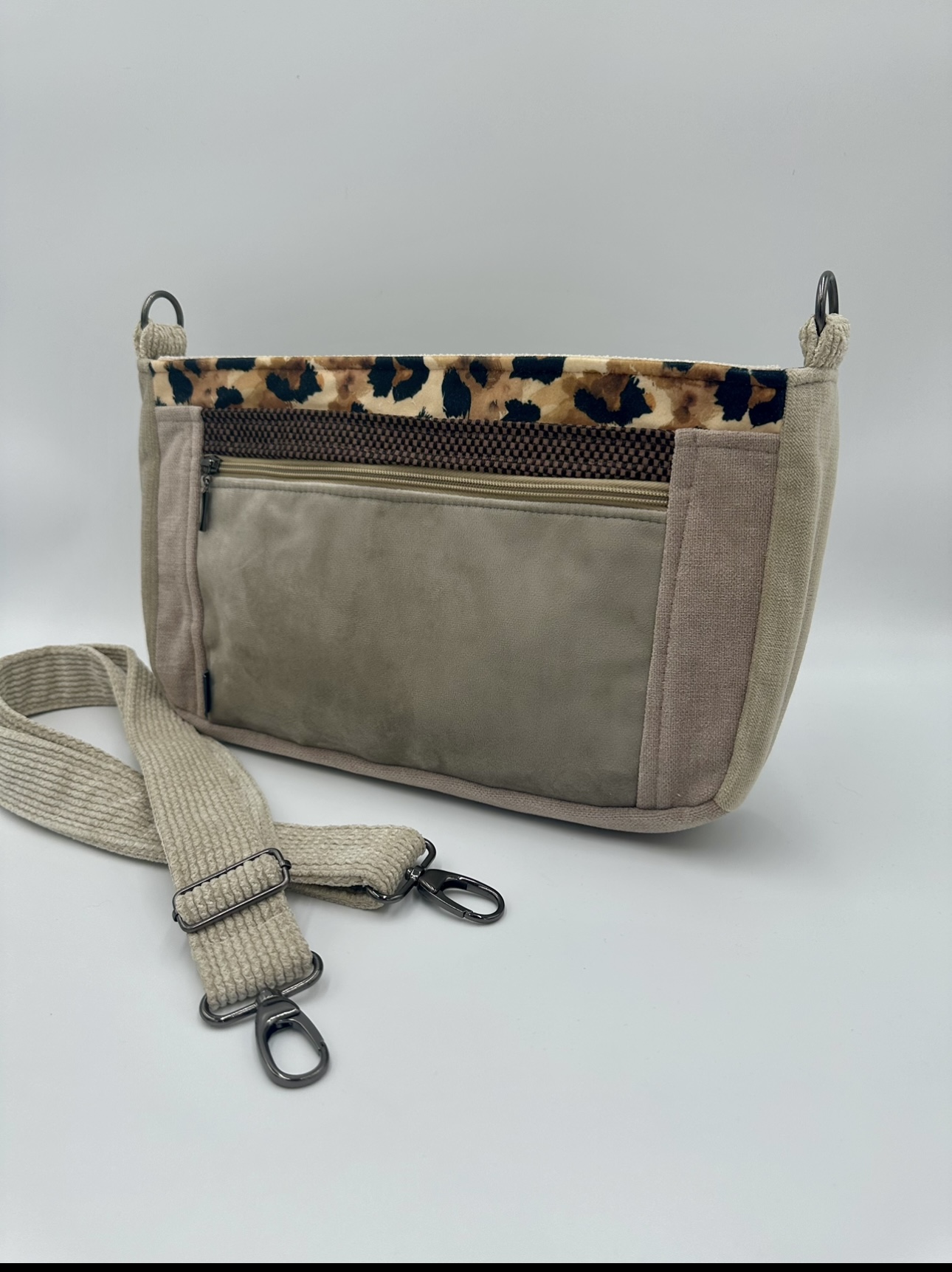 Description: Handmade product made using the upcycling method from high-quality upholstery materials. May contain metal elements, plastics (buckles, zippers), and waterproof linings.